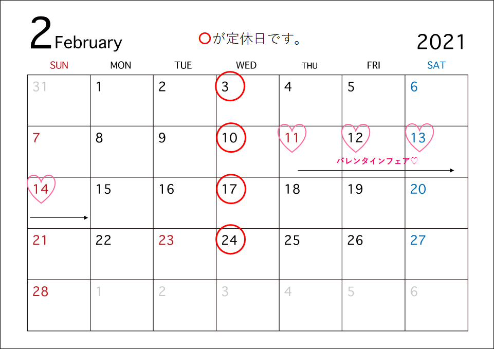 2月11日(木祝)~14日(日)までの期間中、バレンタインフェアを開催予定です♬