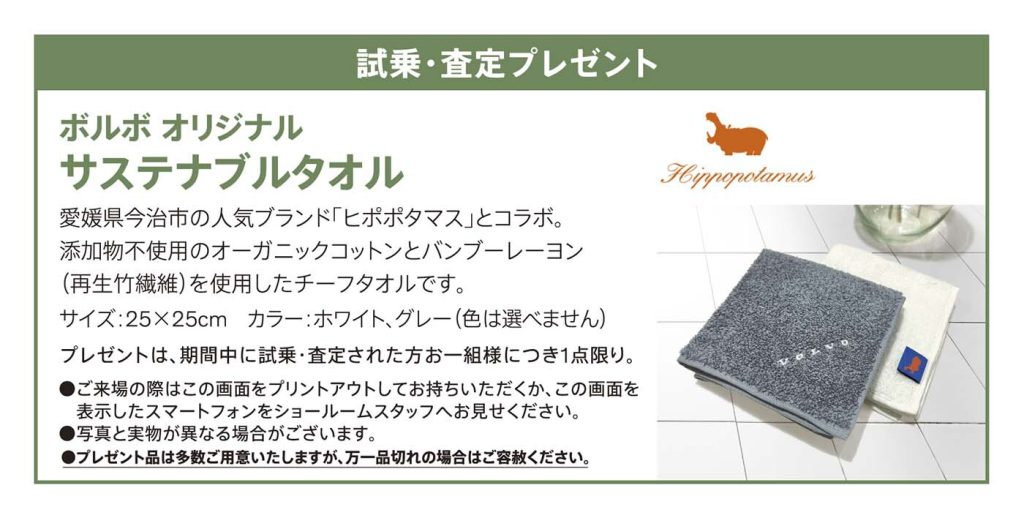 「ボルボ オリジナル・サステナブルタオル」をプレゼントします?